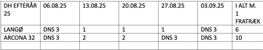 Der har kun været 2 DH både til start. Der er sejlet 3 af 8 mulige sejladser. 4 er aflyst p.g.a. for meget vind og 1 p.g.a. for lidt vind.